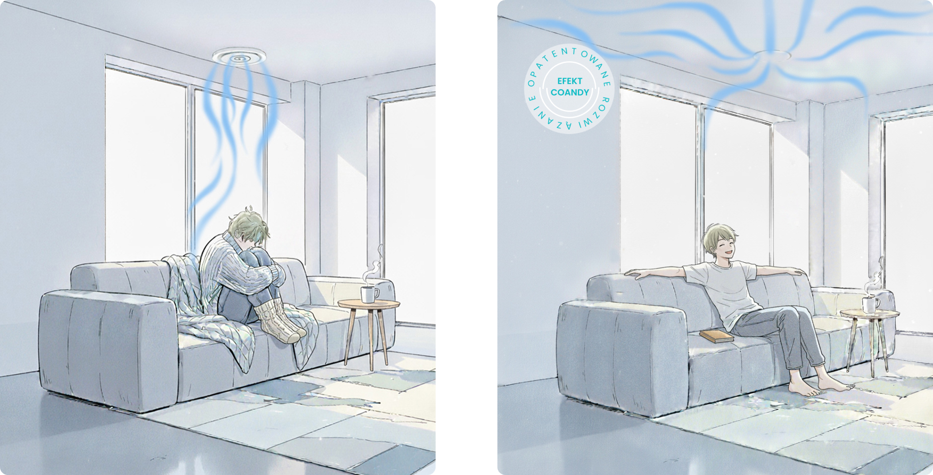 Dzięki efektowi Coandy wydłuża się droga pokonywana przez strugę powietrza, co umożliwia zmniejszenie prędkości powietrza