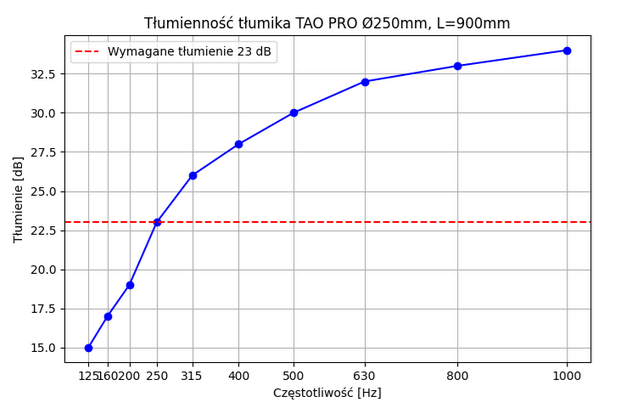 Wykres tłumienności tłumika TAO PRO Ø250 mm, długość 900 mm w funkcji częstotliwości pokazuje że tłumik spełnia wymagania przy 250 Hz i dodatkowo zapewnia większe tłumienie przy wyższych częstotliwościach.