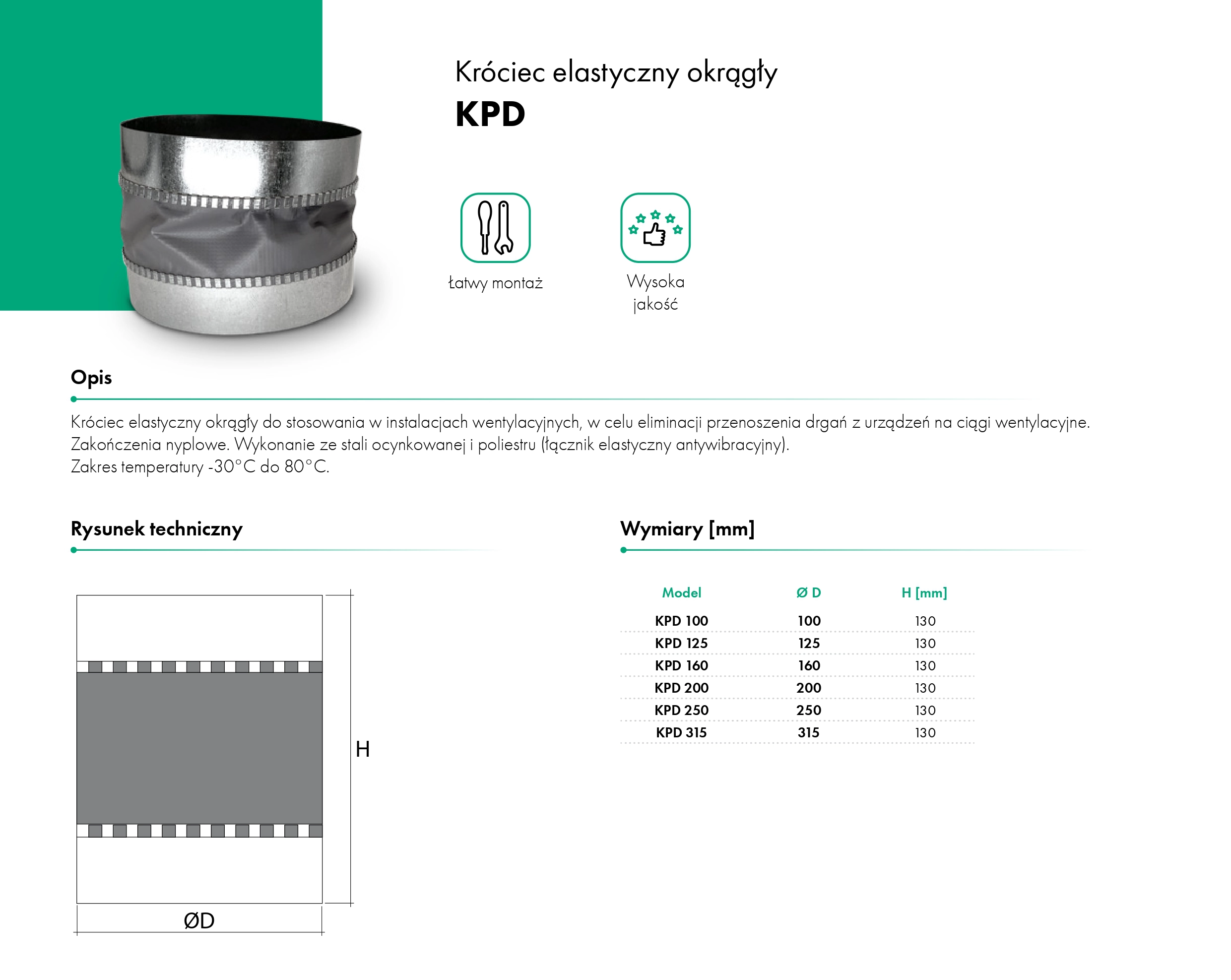 Wykonanie ze stali ocynkowanej i poliestru (łącznik elastyczny antywibracyjny).