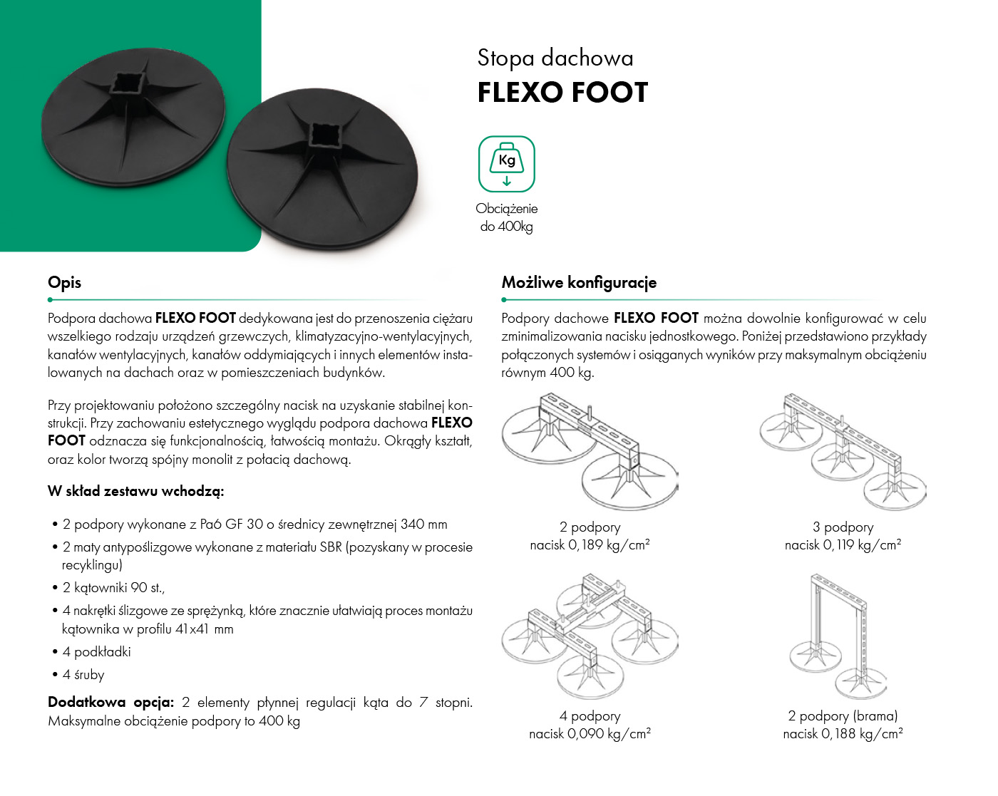 Podpora dachowa Flexo foot przeznaczona jest do przenoszenia ciężarów elementów instalowanych na powierzchniach płaskich. Maksymalne obciążenie podpory to 400 kg.